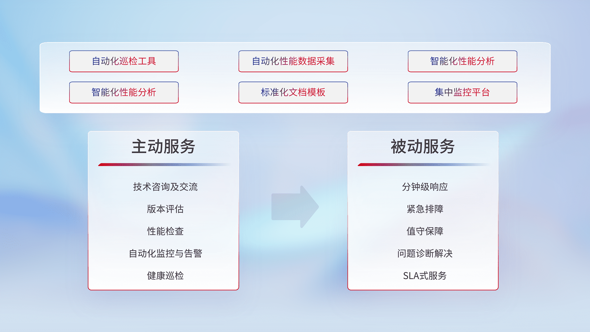 智能化工具和标准化文档,,,,保障服务质量,,,提供主动服务(包含技术咨询、、版本评估、、、性能检查、、自动化监控与告警、、、健康巡检)和被动服务包含(分钟级响应、、、、紧急排障、、值守保障、、问题诊断解决、、、、SLA服务)。。。