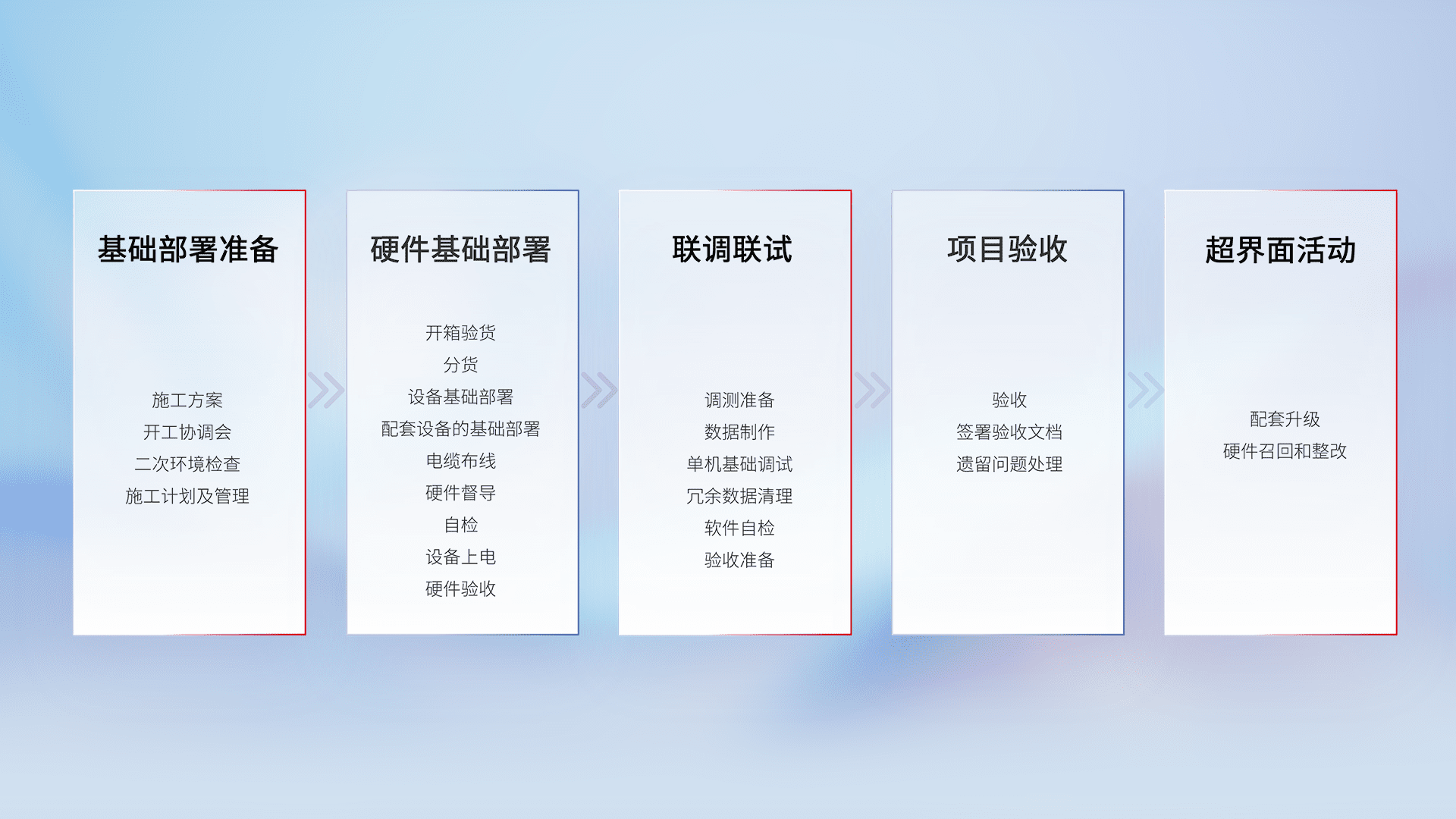 从基础部署准备、、、、硬件基础部署、、、、联调联试、、项目验收、、越界面活动的全过程可追溯,,保证施工质量和进度。。